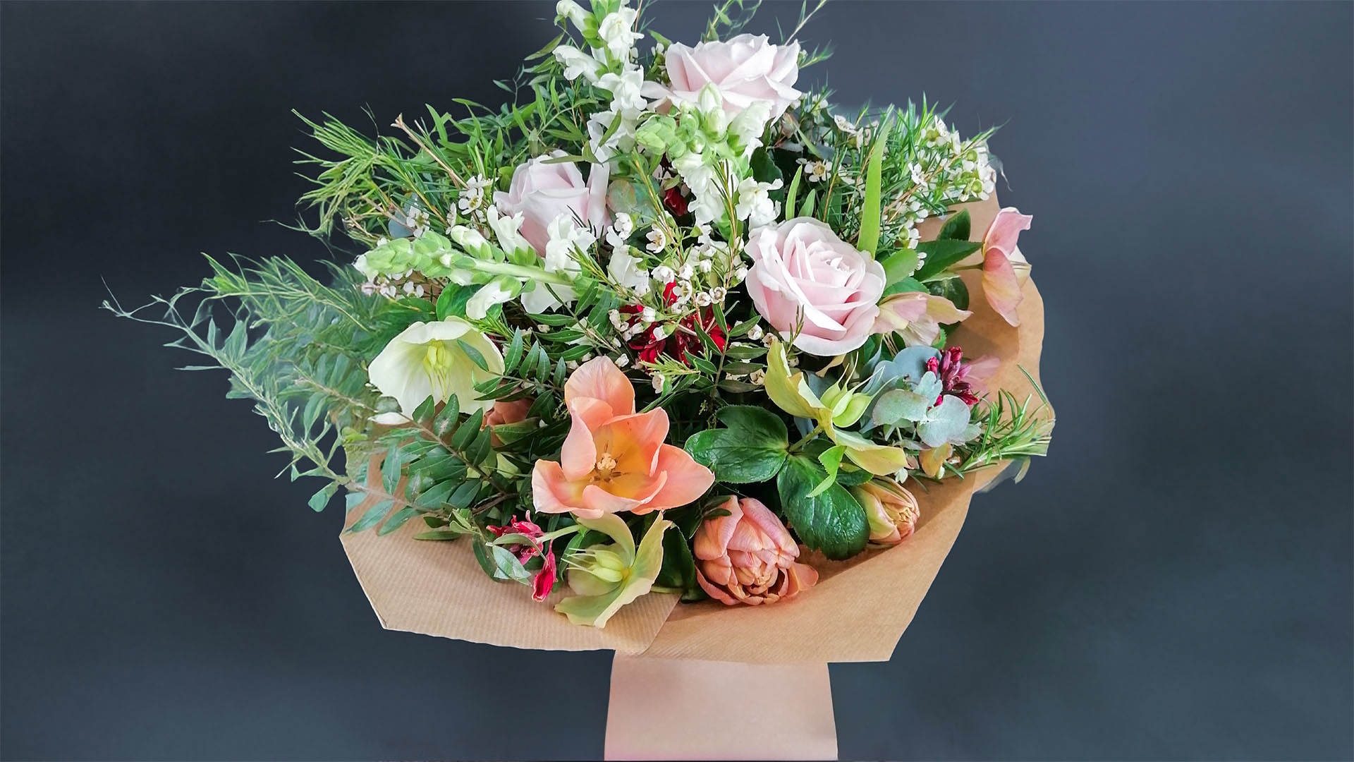 A classic tied sheaf funeral tribute is suitable, for resting on top of a coffin, or to sit beside it. A hand tied bouquet with a flat back, this design is also appropriate to be taken to the graveside or memorial.